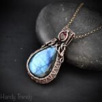 This beautifully handcrafted double stone pendant is made of blue flash labradorite and garnet stone wrapped in copper wire with side curls. This pendant is oxidized for an antique look and polished to highlight the details of the wirework.