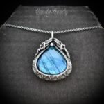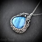 This beautifully handcrafted cage pendant is made of 925 sterling silver wire and blue flash labradorite wrapped in cage style with side chrls. This pendant is oxidized for an antique look and polished to highlight the details of the wirework.