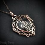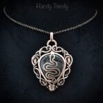 This beautifully handcrafted snake pendant is made of pear shape Moss agate which is wrapped in pure copper wire in free-flow style. This pendant is oxidized for an antique look and polished to highlight the details of the wirework.