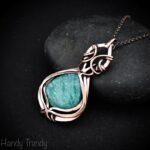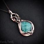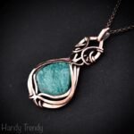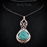 This beautifully handcrafted pendant is made of amazonite which is wrapped in pure copper wire in a curly cage design. This pendant is oxidized for an antique look and polished to highlight the details of the wirework.