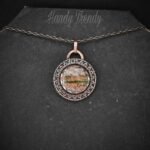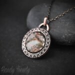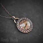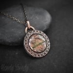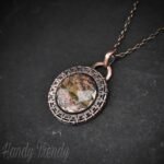 This beautifully handcrafted endless style pendant is made of unakite cabochon which is wrapped in pure copper wire and sheet with round endless wire weaving. This pendant is oxidized for an antique look and polished to highlight the details of the wirework.