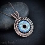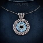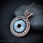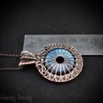 This beautifully handcrafted pendant is made of blue flash labradorite donut stone which is wrapped in pure copper wire with a beautiful weaving pattern. This pendant is oxidized for an antique look and polished to highlight the details of the wirework.