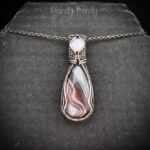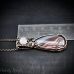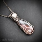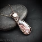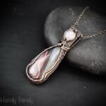 This beautifully handcrafted double stone pendant is made of orange Botswana agate and white moonstone stone which is wrapped in pure copper wire with a beautiful weaving pattern. This pendant is oxidized for an antique look and polished to highlight the details of the wirework.