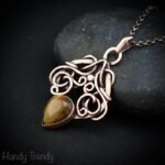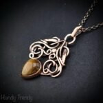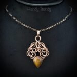 This beautifully handcrafted pendant is made of yellow tiger eye cabochon which is wrapped in pure copper wire in free flow style design. This pendant is oxidized for an antique look and polished to highlight the details of the wirework.