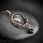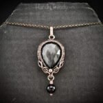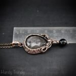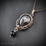 This beautifully handcrafted pendant is made of Rose cut silver obsidian cabochon which is wrapped in pure copper wire with black onyx bead drop and side curls. This pendant is oxidized for an antique look and polished to highlight the details of the wirework.