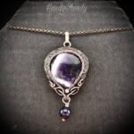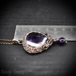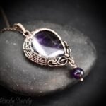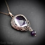 This beautifully handcrafted pendant is made of star amethyst cabochon which is wrapped in pure copper wire with amethyst bead drop and side curls. This pendant is oxidized for an antique look and polished to highlight the details of the wirework.