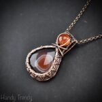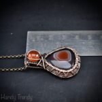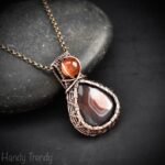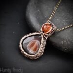 This beautifully handcrafted double stone pendant is made of orange botswana agate and carnelian stone which is wrapped in pure copper wire with a beautiful weaving pattern. This pendant is oxidized for an antique look and polished to highlight the details of the wirework.