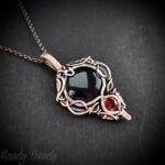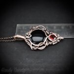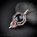 This beautifully handcrafted pendant is made of black onyx and red cubic zirconia which is wrapped in pure copper wire in free-flow style. This pendant is oxidized for an antique look and polished to highlight the details of the wirework.