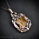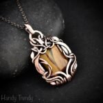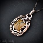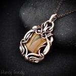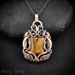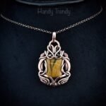 This beautifully handcrafted pendant is made of yellow tiger eye cabochon which is wrapped in pure copper wire in a free-flow style. This pendant is oxidized for an antique look and polished to highlight the details of the wirework.