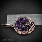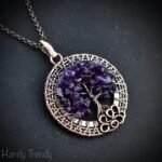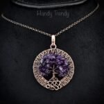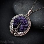 This beautifully handcrafted tree of life pendant is made of amethyst chips beads which is wrapped in pure copper wire. This pendant is oxidized for an antique look and polished to highlight the details of the wirework.