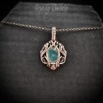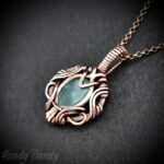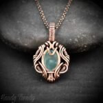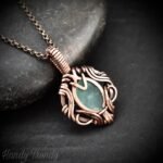 This beautifully handcrafted pendant is made of green aventurine which is wrapped in pure copper wire in free flow design. This pendant is oxidized for an antique look and polished to highlight the details of the wirework.