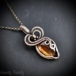 This beautifully handcrafted heart pendant is made of tiger eye cabochon which is wrapped in pure copper wire with a heart design. This pendant is oxidized for an antique look and polished to highlight the details of the wirework.