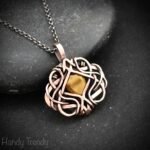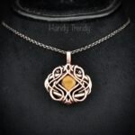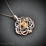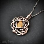 This beautifully handcrafted pendant is made of yellow tiger eye cabochon which is wrapped in pure copper wire in free flow style. This pendant is oxidized for an antique look and polished to highlight the details of the wirework.