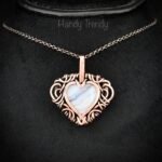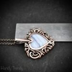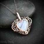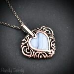 This beautifully handcrafted heart pendant is made of copper wire and blue lace agate stone wrapped in free-flow style. This pendant is oxidized for an antique look and polished to highlight the details of the wire work.