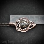This beautifully handcrafted pendant is made of turritella fossil cabochon which is wrapped in pure copper wire in free flow style. This pendant is oxidized for an antique look and polished to highlight the details of the wirework.