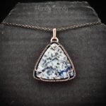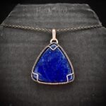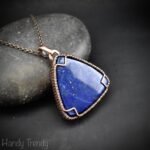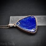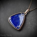 This beautifully handcrafted double sided necklace is made of copper wire and lapis lazuli stone wrapped in a weaving bezel setting. This pendant is oxidized for an antique look and polished to highlight the details of the wirework.
