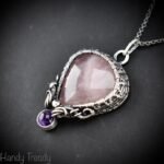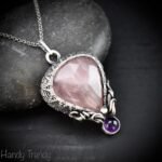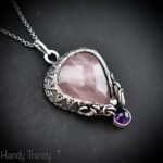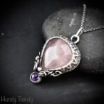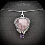 This beautifully handcrafted curly cage pendant is made of rose quartz and amethyst stone which is wrapped in 925 sterling silver wire with a beautiful side curls design. This pendant is oxidized for an antique look and polished to highlight the details of the wirework.