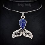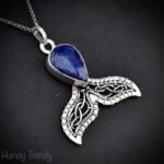 This beautifully handcrafted mermaid tail pendant is made of 925 sterling silver wire and blue lapis lazuli stone wrapped in a bezel setting. This pendant is oxidized for an antique look and polished to highlight the details of the wirework.