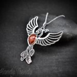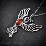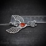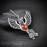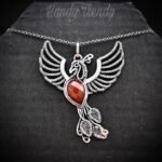 This beautifully handcrafted phoenix pendant is made of 925 sterling silver wire and rose-cut carnelian stone wrapped in a bezel setting. This pendant is oxidized for an antique look and polished to highlight the details of the wirework.