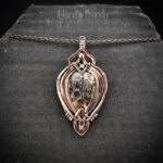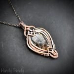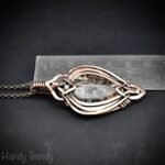 This beautifully handcrafted pendant is made of turritella fossil cabochon which is wrapped in pure copper wire in free flow style. This pendant is oxidized for an antique look and polished to highlight the details of the wirework.